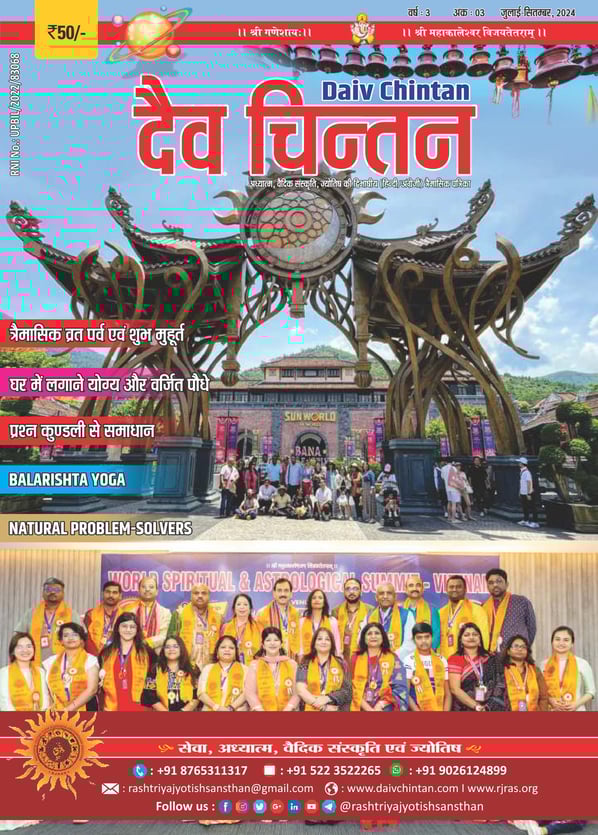 This magazine is registered under the office of Registrar of Newspapers for India (RNI Registration Number: UPBIL/2022/83068). The purpose of this International level bilingual (Hindi/English) quarterly magazine publication is to provide information about Spirituality, Sanatana Vedic culture, Ayurveda, Astrology, Vastu Shastra, Festivals, Auspicious Times, Gems and Rudraksha along with to publish a collection of other socially beneficial articles. Apart from the above, our aim is to promote and broadcast its objectives by providing information about the activities of “Antarrashtriya Sanatan Dharma Parishad Nyas” & “Rashtriya Jyotish Evam Rudraksh Anusandhan Sansthan - RJRAS” Trust and all its associated organisations. For publication in this magazine, articles of life members of “Rashtriya Jyotish Evam Rudraksh Anusandhan Sansthan - RJRAS” Trust and its associated organisations are selected on priority basis.